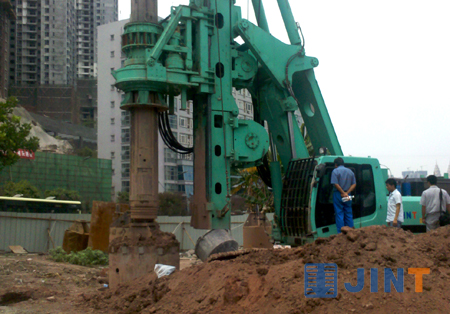 号称四大火炉之一的四川,6月中旬已是酷热难当。炎炎酷暑下,成渝高铁荣昌段施工前线依然在紧张施工中。其中最引人注目的是一台蓝绿色高耸入云的钻机,即金泰公司SD28型多功能钻机。 虽然进场不到三个月,这台设备已工作了700多个小时,完成150多根桩,以其每日完成2、3根桩的施工速度得到了机主的充分肯定。