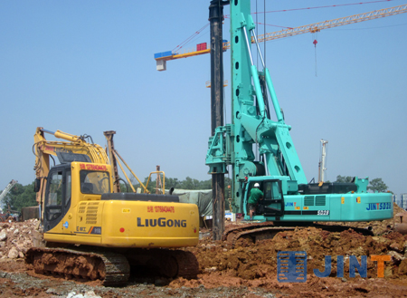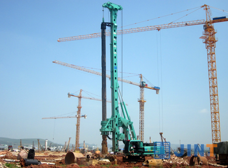 吴圩国际机场南宁市对外的形象窗口之一,承担着极为重要的航空交通责任,是南宁市重大基础设施项目之一。广西壮族自治区、南宁市政府都该项目建设十分重视,专门成立了南宁机场扩建项目工程指挥部,全程跟踪,协调、指导和监督,全力推进项目建设。在这一项目中,基础工程是决定项目进度的关键要素,要在红黏土、密实黏土、微风化白云质石灰岩的地层条件下进行最深达24m桩基施工,岩层最大硬度超过10Mpa。这对钻进施工技术和旋挖钻机性能都是严峻考验。在上海金泰现场服务小组7×24全程保障下,SD28钻机不负众望,与同工地施工的柳工915D挖掘机一起,为保障这一重点工程按期完工在日夜运作,并交出了一份满意的答卷,以单桩2-4小时的效率,远超同工地其他品牌产品,赢得钻机用户、业主单位的好评,在红土地上又一次创造了金泰绿的佳绩。