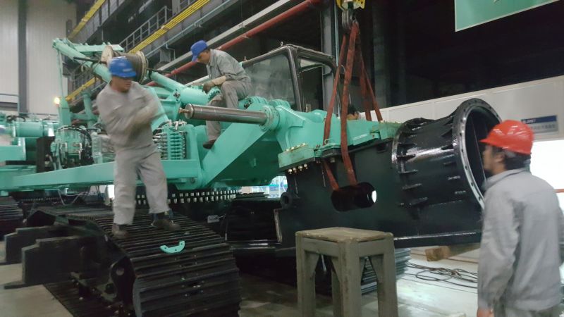 公司装配车间液压班组负责产品液压装配、调试以及新产品厂内试验等工作,为确保展会产品质量过关,两位年轻的车间主任杨东森、陈智奇带着一群20出头的热血青年吃在一线,干在一线,遇到特殊紧急任务,经常工作至深夜。年轻的小伙子们以过硬的技术和认真的态度为设备地顺利运行提供可靠技术保障。眼望一台台新产品驶出装配车间大门,一张张洋溢笑容的脸上露出洁白的牙齿,这是一支青春、乐观,不怕苦、不怕脏、不怕累的队伍。公司生产系统分管领导、总经理助理叶欣每天紧盯现场,奔走在各车间班组,抓进度,催交货,始终与生产系统的干部和员工干在一起。(最大型号旋挖钻机SH46发车)