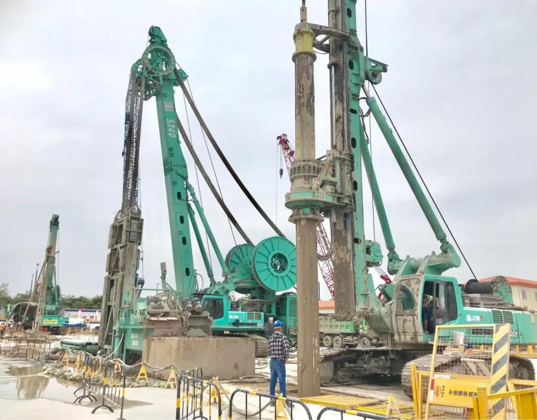 图为2018年4月广州地铁十八和二十二号线横沥站5号井工地,金泰SX40-A、SH30H、SG60A三大主力机型组合接力施工现场