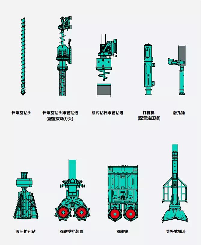 上海金泰注于地下施工设备研发制造60余载,旋挖钻机的多功能特点堪称行业典范。旋挖主机已成功可搭载双轮搅、长螺旋、全套管跟管、液压锤、潜孔锤、双轮铣、导杆抓斗等多种工法装备并得到应用验证。