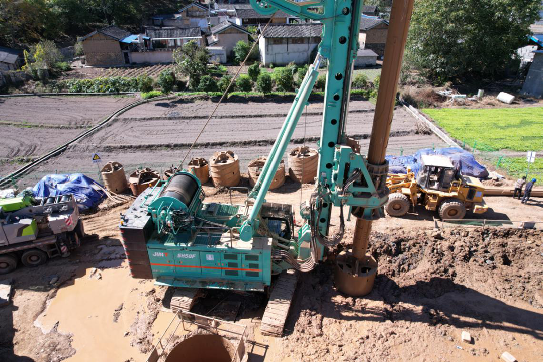 ? ? ? ?近日,金泰国四新产品SH58F多功能旋挖钻首次亮相云南丽江市玉维高速公路段-黎明大桥桩基础施工。该项目钻孔直径大,深度深、地层硬、含丰富沙层、易塌孔、工艺复杂、工期紧,施工具有一定难度。金泰国四新设备SH58F现已完成第六根深度为82m超深钻孔灌注桩,施工速度快,成孔质量高,获承建方高度认可。