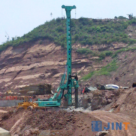 号称四大火炉之一的四川,6月中旬已是酷热难当。炎炎酷暑下,成渝高铁荣昌段施工前线依然在紧张施工中。其中最引人注目的是一台蓝绿色高耸入云的钻机,即金泰公司SD28型多功能钻机。 虽然进场不到三个月,这台设备已工作了700多个小时,完成150多根桩,以其每日完成2、3根桩的施工速度得到了机主的充分肯定。