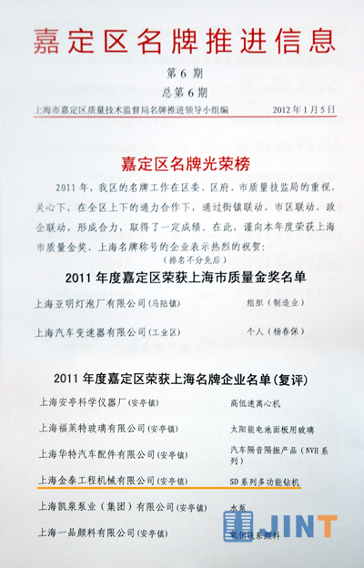 此次SD系列多功能钻机再次被评为“上海名牌”产品,既是对公司多年来不懈努力的褒奖,更是对上海金泰的有力鼓舞,公司将一如既往地以“共筑坚实基础、同创百年工程”经营理念,为国家和社会创造更多价值。