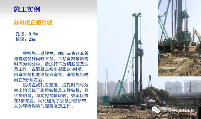 早在去年6月“上海沿江通道越江隧道项目”中,承建单位采用上海金泰SZ80-35全套管钻机进行抗拔桩施工,成功实现了软土地质条件下无泥浆施工,并顺利通过了上海建工集团、上海隧道股份有限公司、上海市基础工程集团等部门评审和验收,为在江浙沪等地区的灌注桩实现无泥浆化施工提供了一种新的可能。此次成功实现咬合桩施工,又将进一步拓展SZ80-35的应用领域。