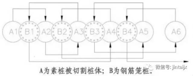 全套管咬合桩施工的跳桩方式并不是简单的“进一退一”渐进模式,而是采取连续跳桩方式,这样可以合理利用素砼的缓凝时间,在保证成桩质量的同时,又能提高施工效率。一般情况下,全套管钻进连续跳桩的施工顺序为A1→A2→A3→B1→A4→B2→A5→B3→A6→B4……(如下图所示)。