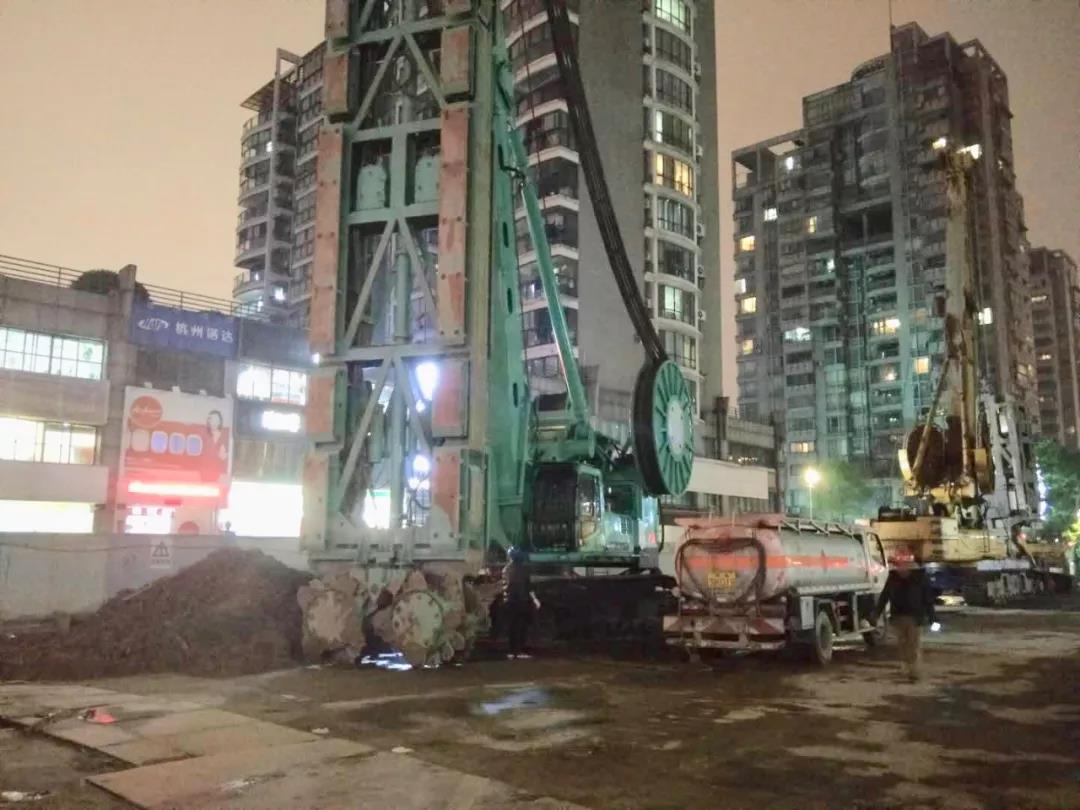图为2018年4月广州地铁十八和二十二号线横沥站5号井工地,金泰SX40-A、SH30H、SG60A三大主力机型组合接力施工现场